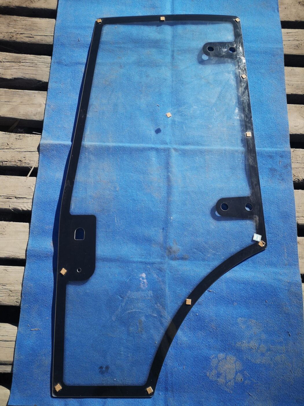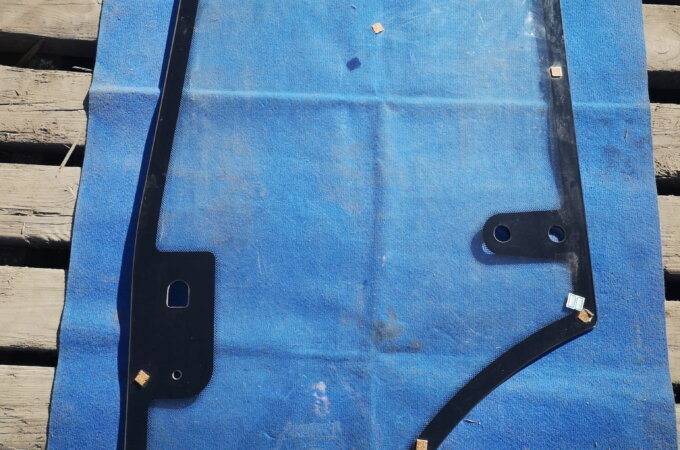 TES25A.45u.15-04 Foton 254 traktori vasaku ukse klaas (mõõtmed: esiserv 153 cm, ülemine serv 64 cm, alumine serv 34 cm, tagumine serv 103 cm, laius 77 cm, hingeaukude keskpunktide vaheline kaugus 70 cm).