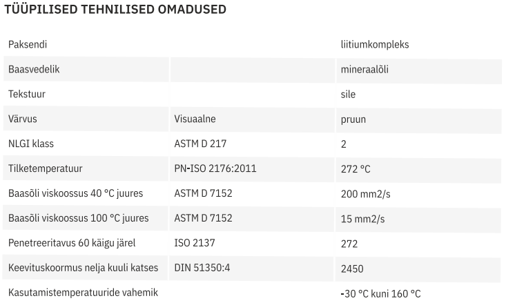 - Liitiumseebist Paksend: Liitiumkompleks muudab määre vastupidavaks kõrgetele temperatuuridele ja annab sellele suurepärase mehaanilise stabiilsuse.